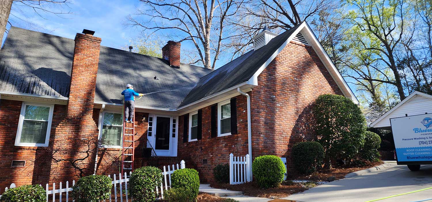 A clean roof will not only look better, newer and improve the curb appeal of your home, it will also help your roof perform better by eliminating contaminants that can destroy the lining of shingles, rotten debris that can attract wood eating insects and plug your gutters and organic growths that can cause health problems, moisture infiltration and surface decay. Bluewhale Powerwash is a professional roof cleaning company serving Union and Mecklenburg Counties including Charlotte, Matthews and Mint Hill.